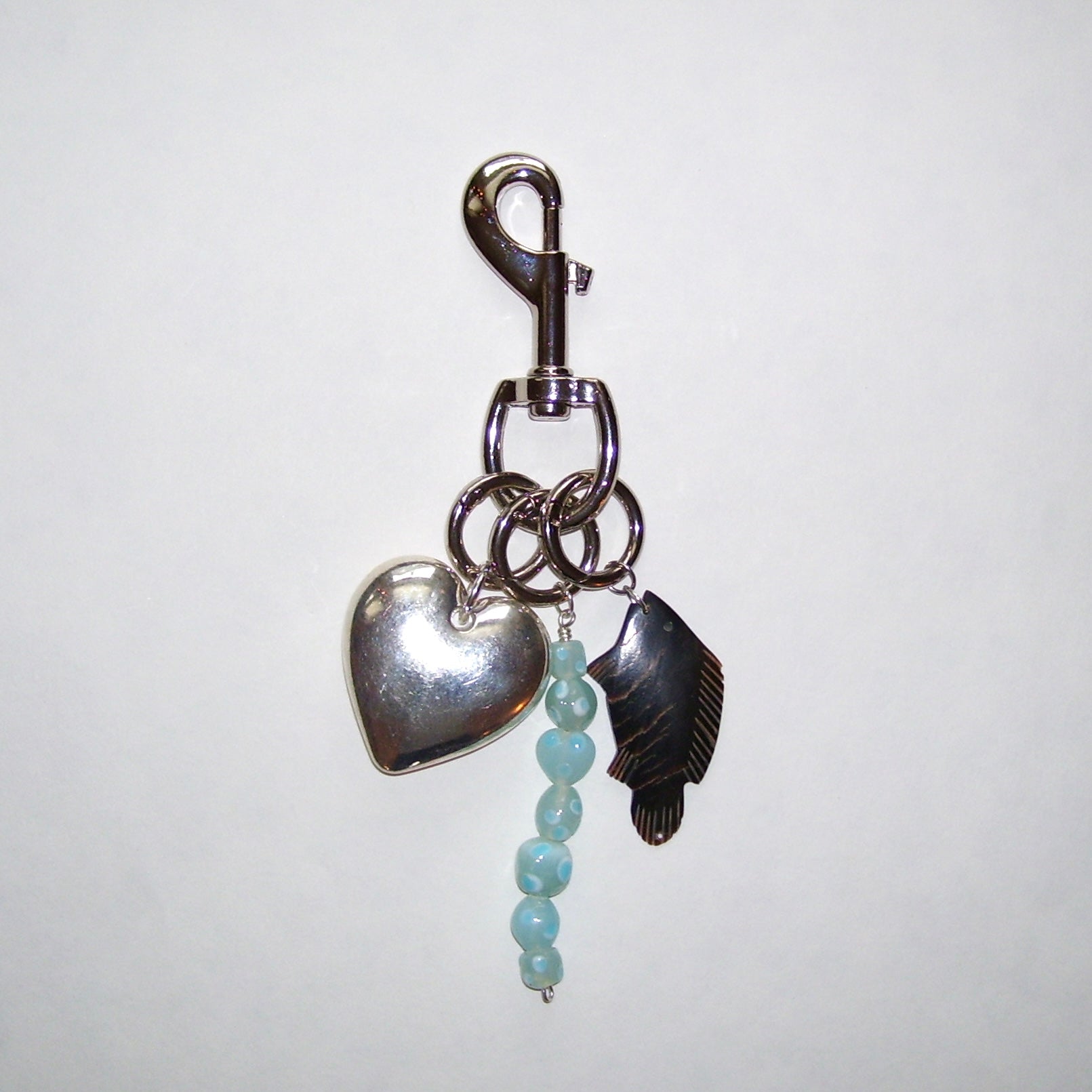 Vintage heart pendant, vintage blue glass polka dot beads, vintage stone carved fish pendant